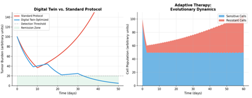 Modeling the evolutionary dynamics of cancer is essential for overcoming drug resistance [104, 105]. Recent research emphasizes "adaptive therapy," where treatment is modulated to maintain a population of sensitive cells that can suppress the growth of resistant clones [44, 104]. Figure 6 is composed of two parts that contrast traditional treatment with modern, model-driven approaches. The left panel of Figure 6 compares a standard, fixed-schedule chemotherapy protocol with a "Digital Twin Optimization" protocol. While the standard protocol applies the same dose at set intervals, the digital twin uses a patient-specific model to simulate outcomes and selects a personalized schedule that more effectively and consistently drives down the simulated tumor burden. The right panel illustrates the concept of "Adaptive Therapy," an evolutionary approach. Instead of trying to eliminate all cancer cells, treatment is modulated (on and off) to maintain a stable population of drug-sensitive cells. These sensitive cells, in turn, competitively suppress the growth of resistant clones, thereby preventing or delaying the onset of incurable, drug-resistant disease.