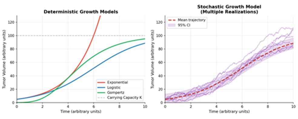 Classical models such as the Gompertz and logistic growth formulations remain foundational [3, 4]. However, recent advancements have introduced stochastic modeling to account for the inherent randomness in tumor evolution and treatment response [15, 16]. These models are particularly useful for predicting the "first-passage-time" of tumor recurrence or the emergence of resistant clones [15, 18].
