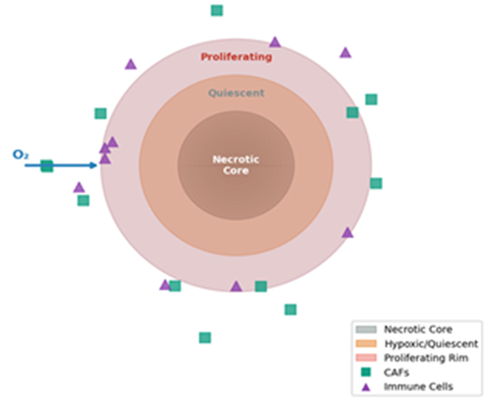 Figure 2: Spatial Tumor Microenvironment: Necrotic Core, Hypoxic Zone, Proliferating Rim, CAFs, and Immune Cells (PDE Model Concept)