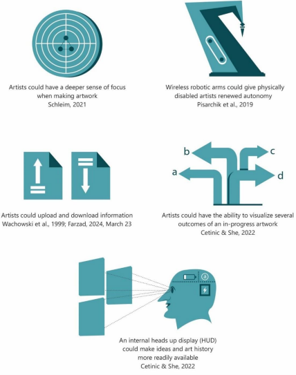 A final possible improvement to the artist includes the prospect of an internal heads-up display (HUD). In the mind, the internal screen could give artists enhanced visualizations that assist them with pertinent information. Like an information kiosk at a crossroads thoroughfare, the overlaying information could provide the artist with additional means to see images on top of a physical canvas through the vast imagination of the brain. Another emerging advancement that could potentially arise with this neurological device is the ability to visualize several outcomes of an in-progress artwork, especially if the invasive brain-machine interface has artificial intelligence (Cetinic & She, 2022).