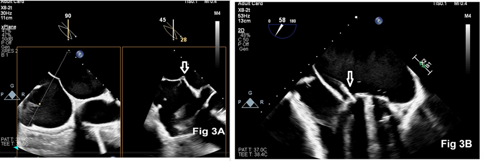 Figure 3: Two-dimensional echocardiography showing trans-septal puncture (Fig 3A) and a steerable introducer sheath positioned at the paravalvular leak (Fig 3B)