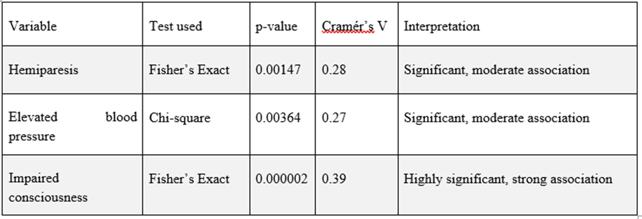 All three variables showed statistically significant associations with patient outcome (Table 2). Impaired consciousness had the strongest relationship (Cramér’s V = 0.39), followed by hemiparesis (0.28) and
