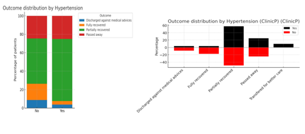 Key findings: Impaired consciousness at presentation is the most powerful predictor of poor outcome, with nearly half of affected patients dying during hospitalization. Hemiparesis is significantly associated with poorer recovery, reflecting more severe neurological injury. Elevated blood pressure at presentation is also significantly associated with outcome, suggesting a marker of systemic severity and possibly larger or more severe strokes. Overall, these results emphasize that neurological deficits and systemic severity markers at presentation are critical predictors of stroke outcome.