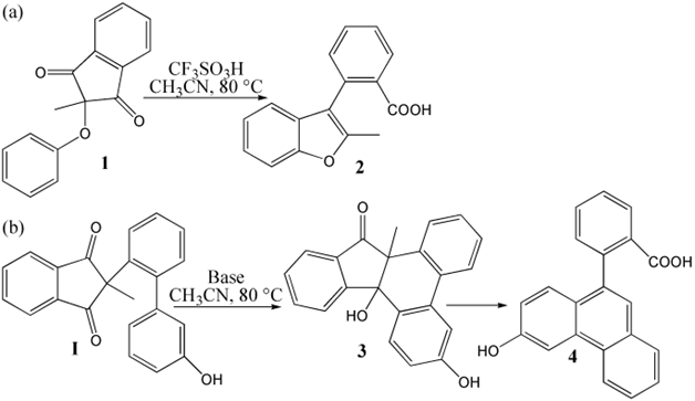 Scheme 1 (a) CF3SO3H-promoted [1,5] Friedel−Crafts of 2-aryoxy-1,3-indandione 1 leading to 2-substituted-3-aryl benzofuran 2; (b) Base-facilitated [1,6] Friedel−Crafts of 1,3-dicarbonyl I resulting in polycyclic alcohol 3 then transformed into biaryl carboxylic acid 4.
