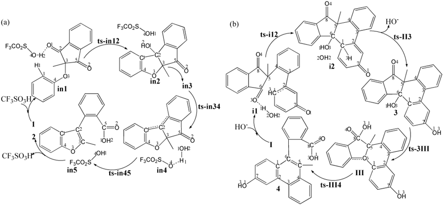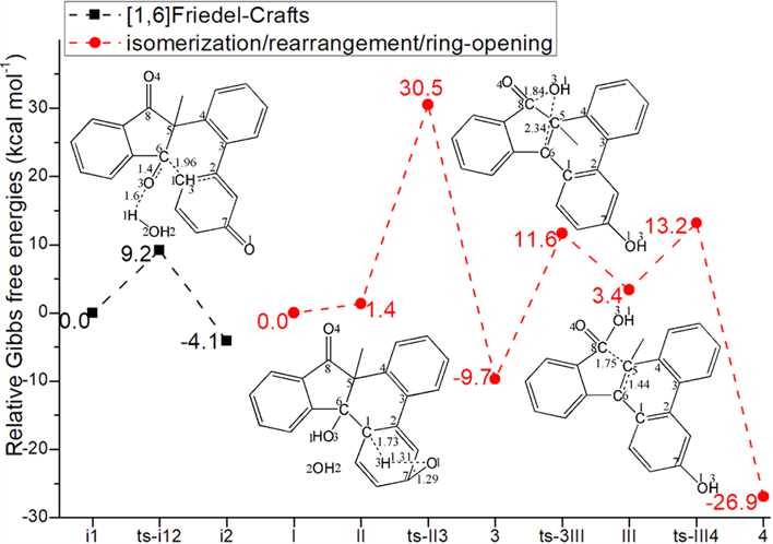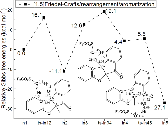 The mechanism was explored for (a) CF3SO3H-promoted [1,5] Friedel−Crafts of 2-aryoxy-1,3-indandione 1 leading to 2-substituted-3-aryl benzofuran 2; (b) Base-facilitated [1,6]Friedel−Crafts of 1,3-dicarbonyl I resulting in polycyclic alcohol 3 then transformed into biaryl carboxylic acid 4 (Scheme 1). Illustrated by black arrow of Scheme 2a, an intramolecular [1,5]Friedel−Crafts addition of 1,3-indandione 1 took place by activating carbonyl through H bridge with CF3SO3H as Bronsted acid. Then the resulting tertiary alcohol in3 underwent dehydration assisted by CF3SO3H to produce reactive carbocation in4, which then instigated a cascade of carboxyl group formation, ring-opening via C−C bond dissociation and C=C bond formation realizing aromatization. The final product 3-aryl-2-benzo 2 was yielded binding recovered CF3SO3H. Shown by black arrow of Scheme 2b, the electron-rich phenoxy group was deprotonated under the catalysis of base HO- forming water.The initial nucleophilic addition underwent with spatial-adjacent carbonyl resulting in dieneone II after removal of HO-. Subsequently, II isomerized to the first product polycyclic alcohol 3, from which carboxylation proceeds via hydroxyl shift rearrangement followed by ring-opening aromatization leading to the second product biaryl carboxylic acid 4. The schematic structures of optimized TSs in Scheme 2 were listed by Figure 1. The activation energy was shown in Table 1 for all steps. Supplementary Table S1, Table S2 provided the relative energies of all stationary points. According to experiment, the Gibbs free energies in acetonitrile solution phase are discussed here.