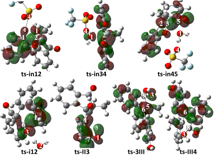 The initial complex is located as in1 involving H bond stabilization between CF3SO3H and carbonyl of 1. An intramolecular [1,5]Friedel−Crafts addition took place via ts-in12 in step 1 with the activation energy of 16.1 kcal mol−1 relative to starting point in1 exothermic by -11.1 kcal mol−1 producing tertiary alcohol in2 (black dash line of Figure 1a). The transition vector includesdual proton transfer C1···H1···O4, O4···H2···O1, resultant stretching of C2-O1 double bond to single one and the slightly delayed nucleophilic addition of C1 to C2 (1.0, 1.5, 1.4, 1. 1, 1.3, 1.96 Å) (Figure S1a). Obviously, the driving force is attributed by H bridge from CF3SO3H via simultaneously activating nucleophilic C1 and carbonyl C2=O1. Once C1-C2 is bonded, carbonyl becomes hydroxyl O1H2 in the new five membered ring of in2, which transformed to in3 more reactive with relative energy increased by 23.7 kcal mol−1 ready to initiate next step.