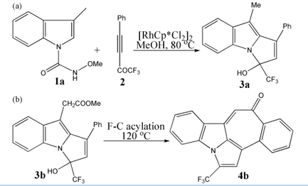 Pyrrolo[1,2-a]indoles are privileged members pharmaceutically. As important natural products, they are also powerful molecules with antibacterial, antinociceptive, anti-inflammatory, and antitumor activities [1-3]. Among many representative examples, the derivatives with trifluoromethyl (CF3) unit are especially sought-after in fields of biochemical, agrochemical, medicinal, and material sciences. Thus the synthesis of CF3-pyrrolo[1,2-a]indole has received wide interest in recent years [4]. Many protocols could enable construction of carbon−carbon or carbon−heteroatom bond via photoredox, cascade, and transition-metal (TM)-catalyzed C−H bond activation (CHA) [5-7]. In this aspect, Yu developed the selective synthesis of dihydropyrimido[1,6-a]indol-1(2H)-ones via Rh(III)-catalyzed [3 + 3] or [4 + 2] C−H annulation [8]. Chen achieved Rh(III)-catalyzed selective olefination of N-carboxamide indoles with unactivated olefins via internal oxidation at room temperature [9]. Duan reported divergent synthesis of trifluoromethyl-substituted (dihydro)-pyrimidoindolones via Rh(III)-catalyzed C−H activation/annulation of N-carbamoylindoles with CF3-imidoyl sulfoxonium ylides [10].