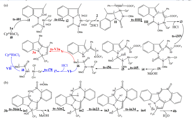 The mechanism was explored for (a) Rh(III)-catalyzed cascade reaction of N-alkoxycarbamoyl indole 1a with CF3–ynone 2 leading to pyrrolo[1,2-a]indole 3a (b) cycloheptenone fused indole 4b from pyrrolo[1,2-a]indole acetate 3b (Scheme 1). Illustrated by black arrow of Scheme 2a, initially, Rh(III)-catalyzed carbamoyl N2-H bond and indoyl C1−H bond cleavage of 1a gives five-membered rhodacycle I via two steps of reversible CMD process. After the removal of two HCl, the coordination of triple bond of 2 with Rh(III) of I furnishes intermediate II, from which the following migratory insertion of activated triple bond into Rh−C bond generates III. Next assisted by one additional HCl, proto-demetalation of III affords intermediate IV, which forms intermediate i5 involving H-bond after the addition of an extra MeOH molecule to carbonyl group. Then, the N-alkoxycarbamoyl unit embeded in i5 is removed to give V and VI. Subsequently, V undergoes concerted proton transfer and intramolecular N-nucleophilic addition to afford product 3a(red arrow). Meanwhile with a second HCl, proto-demetalation of VI gives methyl methoxycarbamate (VII) and regenerates Rh(III) catalyst (blue arrow).