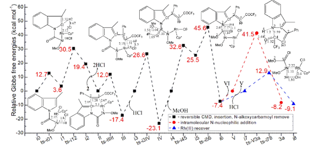 Under the promotion of Rh(III), the MeOH embed into carbonyl group via ts-i45 is determined to be rate-limiting. This clarifies why N-alkoxycarbamoyl group is indispensable for C−H bond activation in experiment. Furthermore, the product generation and catalyst recover are both favorable thermodynamically. To highlight the idea of feasibility for changes in electron density and not molecular orbital interactions are responsible of the reactivity of organic molecules, quantum chemical tool Multiwfn was applied to analyze of electron density such as MBO results of bonding atoms and contribution of atomic orbital to HOMO of typical TSs (Table S3, Figure S2). These results all confirm the above analysis.