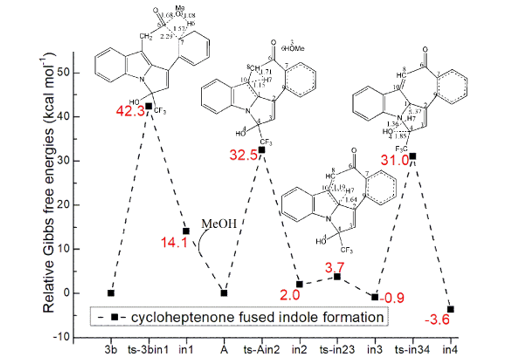 With C1-H7 in hand, the final β-elimination together with dehydration occurs via ts-in34 in step 4 with a barrier of 31.9 kcal mol−1 exothermic by -3.6 kcal mol−1delivering in4. The transition vector is composed of a third proton H7 transfer from C1 to O4, C4···O4 separation forming H2O molecule (1.37, 1.36, 1.85 Å) (Figure S1j). When H2O is lost from in4, the desired 4b is obtained with new C3-C4 double bond. The Friedel−Crafts acylation is rate-limiting for cycloheptenone fused indole formation. All barriers are readily to overcome under high temperature of experiment.