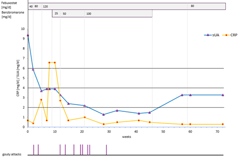 After intensive discussion and information on the different ULT approaches, patients should be given the opportunity to decide for themselves whether they prefer an intensive treatment course of ULT – with potentially more frequent and severe attacks – or a more moderate approach. In our experience, numbers and intensity of attacks are variable to a large extend not only with moderate (sUA, <4.0 mg/dl), but also with intensive treatment (sUA, <2 mg/dl), as demonstrated by the two cases following.