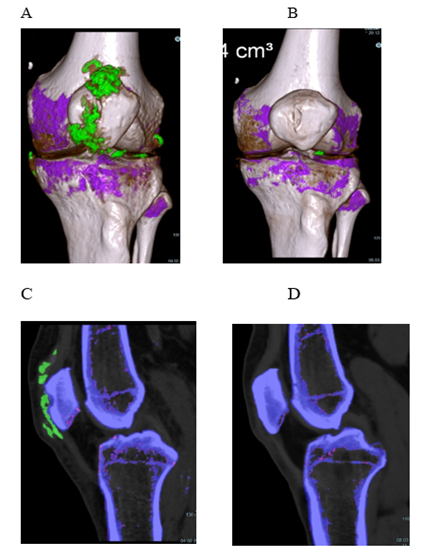 Figure 3: Patient 2, dual energy computed tomography of his left knee. 3D reconstruction (A+B) and sagittal reformatted source images (C+D). – A, C and B, D: 4 weeks and 61 weeks, respectively, after start of uric acid lowering treatment