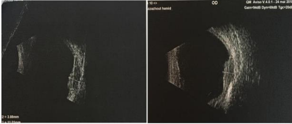 Figure 1: On ultrasound, a dome-shaped hypoechoic choroidal lesion in the superotemporal quadrand with a sign of excavation choroidal and without rupture of the Bruch's membrane.