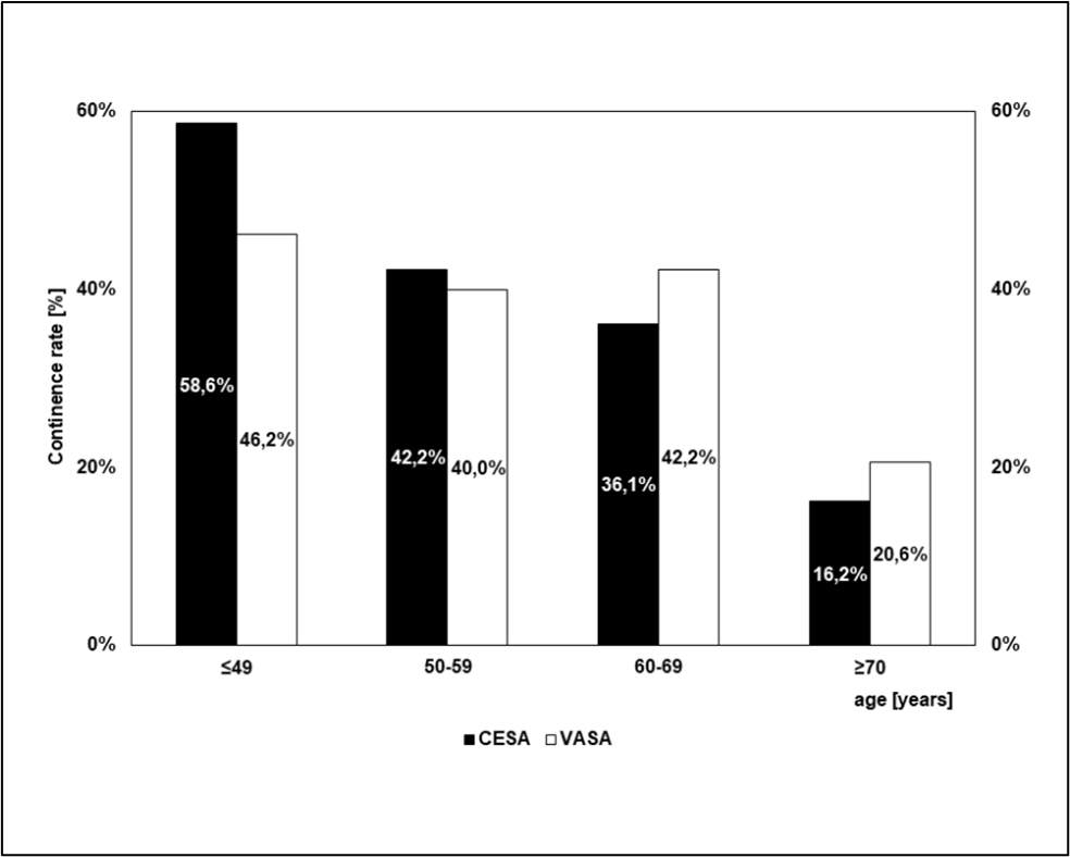 Figure 4: Continence rates after CESA or VASA depending on the age at the time of surgery.