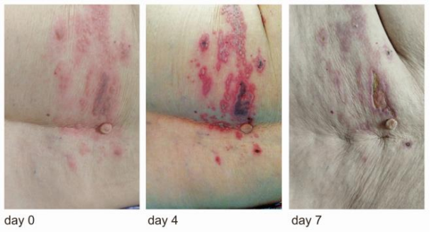 Figure 1: Change in the appearance of skin inflammation caused by Herpes zoster after treatment with Detoxsan® paste.