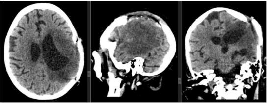 Postoperative changes in the left frontoparietal region are not recent, comparatively cerebral edema has increased in the left cerebral hemisphere and it is striking that the areas of bleeding in the surgical bed are larger. as well as herniation of the brain and an increase in the volume of the epicranial soft tissues. It is striking that the bone flap is more dislocated than in the previous study.