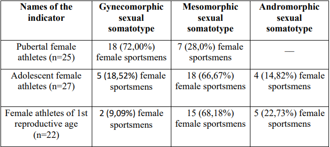 After determining the values of shoulder width and pelvis width, all the athletes of the three study groups were divided into sex somatotypes, according to the IPD indicators according to the classification of J. Tanner and W. Marshall (2004) [1, 7, 8, 10]. The results of the conducted somatotyping and the distribution of athletes by sex somatotypes are presented in Table.
