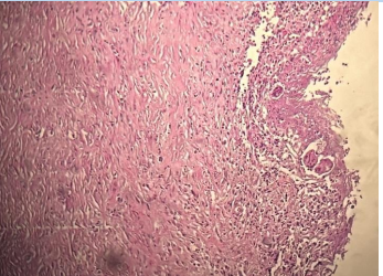 Figure 1: Surface epithelial lining was largely ulcerated and replaced by polymorphic granulation