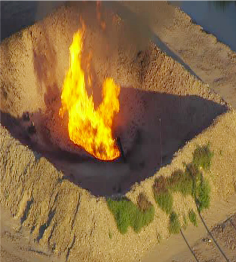 Pit flare also known as pilot burners, are often parallel to the ground and visible through a fire brick wall, clay wall and/or fence that surrounds the flare pit. A burn pit should be placed away from all common work areas and operating plants, where the smoke and associated thermal plume will not threaten personnel or damage equipment. It should be at least 1,000 feet (305 m) long, clear of all structures and public car parks, households and not be obstructed by local or general environmental conditions. Figure 3 depicts the appearance of a typical pit flare (Naoinc, 2021).