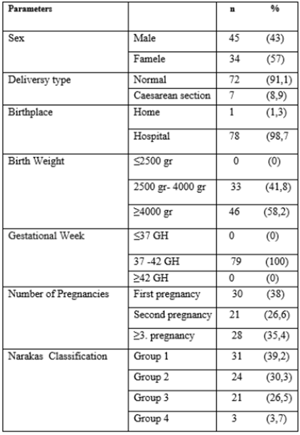 Of the patients included in the study, 57% were female and 43% were male. The age of admission to our hospital varied between the first day of life and 14 years of age. The mean age of presentation of 79 patients was found to be 14.7±3.7 months. While 80% of the patients were noticed by their families within the first month, 97% were noticed within the first 3 months. Of the patients, 91.1% had a normal vaginal delivery and 8.9% had a cesarean delivery. It was determined that 98.7% of the patients were born in the hospital and only one patient (1.3%) was born at home. 58.2% of the patients were over 4000 grams, 41.8% were between 2500-4000 grams. There were no patients born under 2500 grams. The mean birth weight of our patients was 3987.57±528.424 (2750-6000) grams. Demographic information of the patients is shown in Table 1.
