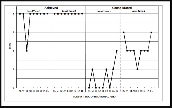 Figure 2 represents the patient’s achieved and consolidated development levels profiles at Times 1 and 2 for the socio-emotional area. The evolution of the achieved development levels was noted in the only domain that was not achieved at the maximal level score (Vocal Imitation). Meanwhile, the consolidated levels of all nine domains increased (Table 3), particularly in Receptive Language (an increase of three developmental levels). Thus, while the slight increase in the mean achieved levels was not significant (mean differences = 0.73), the mean consolidated levels increased significantly (mean differences = 1.56) (Table 4).