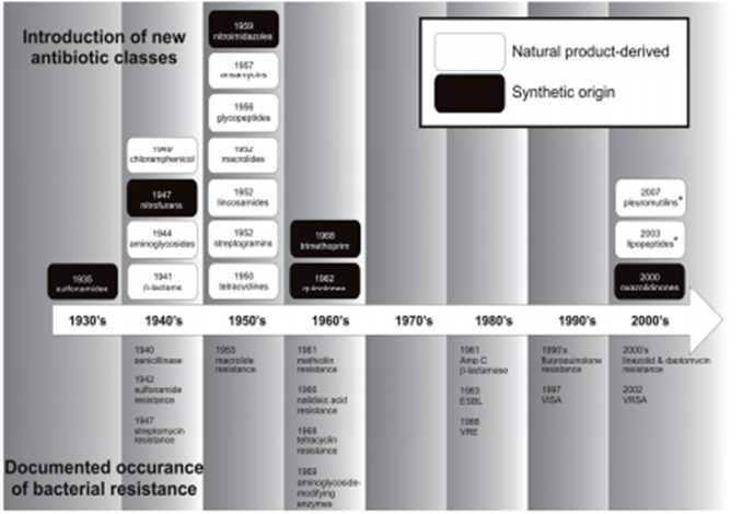 Figure 1: Timeline for the introduction of major, broad-spectrum antibiotic classes for systemic application in the clinic, and documented occurrence of bacterial resistance (adapted from (Brötz-Oesterhelt & Sass, 2010). The asterisk denotes two new antibiotic classes with a single representative (i.e., lipopeptide daptomycin and pleuromutilin retapamulin), both of which are intended for topical application. However, analogs for systemic application (oral or i.v.) are being developed (also see Section 3.1.4). ESBL (extended-spectrum) β-lactamase, VISA (vancomycin intermediately resistant Staphylococcus aureus), VRE: vancomycin-resistant Enterococcus; VRSA: vancomycin-resistant S. aureus.