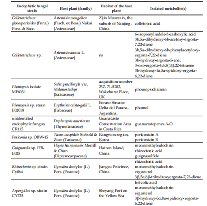 Table 1: Plant endophytic fungi producing metabolites with antibacterial activity