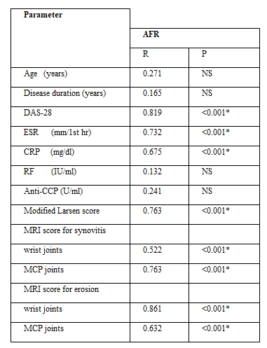 There was significant increase in laboratory parameters and increase in albumin fibrinogen ratio in rheumatoid patients as compared to healthy control subjects (table 1). table 2 demonstrate radiographic score of rheumatoid patients. Also, there was positive correlation of the AFR with X ray and MRI score for synovitis and bone destruction (table 3)