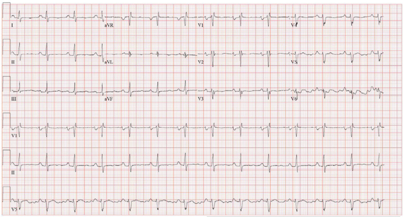 Figure 1: Electrocardiogram (ECG) demonstrating normal sinus rhythm with left atrial enlargement, rightward QRS axis, and incomplete right bundle branch block.