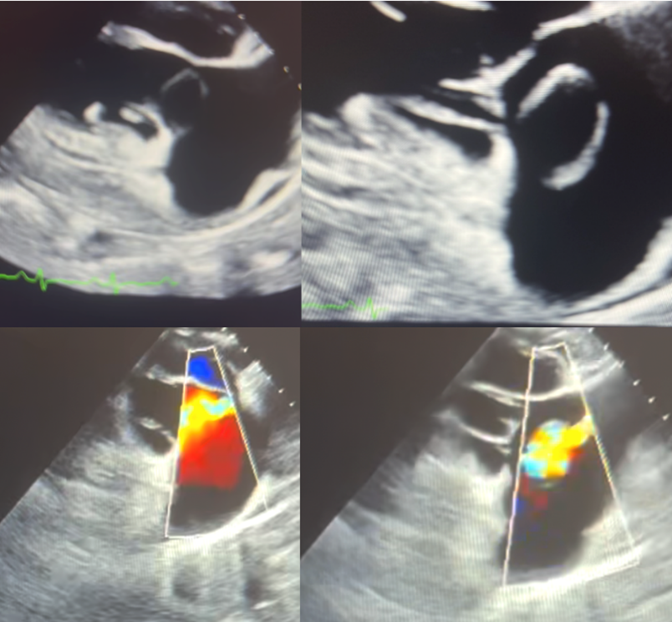 Figure 2: Transesophageal echocardiographic evaluation of the tricuspid valve. The left panes depict diastole, and the right panes depict systole; corresponding color Doppler imaging is shown in the lower panels. A cystic-appearing structure adjacent to the tricuspid valve annulus is noted, with color flow observed during both systole and diastole—findings suggestive of an aorto-atrial shunt from a ruptured sinus of Valsalva aneurysm.