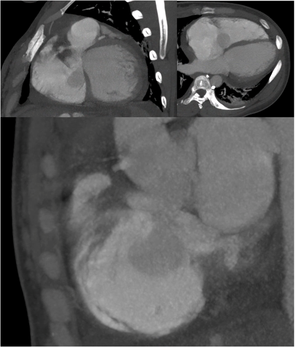 Cardiac computed tomography angiography can also be a valuable tool in the diagnosis and management of sinus of Valsalva aneurysm rupture. This patient population is typically young and often at low to intermediate risk for obstructive coronary artery disease. In such cases, cCTA can reliably exclude coronary disease, potentially avoiding the need for invasive coronary angiography—particularly when the involved sinus corresponds to the origin of a coronary artery. Moreover, engagement of the coronary ostia during angiography may be technically challenging due to anatomical distortion and structural injury. While surgical repair remains the standard of care, emerging transcatheter, nonsurgical alternatives have been proposed (Latzman et al., 2006; Weinreich et al., 2015). In this context, cCTA can serve as an accurate tool for preprocedural planning. In our patient, SOVAR evaluation with chest CTA was partially limited by motion artifact at the level of the aortic root and suboptimal bolus timing for aortic evaluation. Nevertheless, it provided key diagnostic clues. Notably, there was evidence of negative contrast and swirling flow within the right atrium, largely isointense to the ascending aorta, consistent with a left-to-right shunt. Additionally, an aneurysmal outpouching of the non-coronary sinus projecting into the right atrium was clearly visualized.