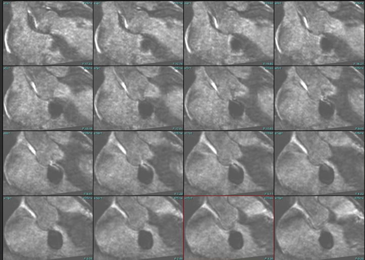 Figure 8: Three-dimensional multiplanar reconstruction (3D MPR) from cardiac magnetic resonance imaging. Sequential static slices demonstrate an aneurysmal outpouching arising from the noncoronary sinus of Valsalva and projecting into the right atrium. The reconstruction highlights the anatomical morphology, orientation, and continuity of the rupture tract, offering precise localization of the aorto-atrial communication. This static dataset complements dynamic imaging by providing high spatial resolution for pre-surgical planning and anatomical delineation.