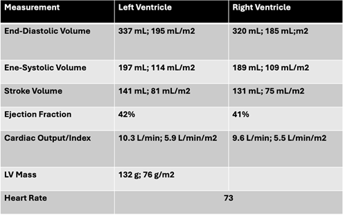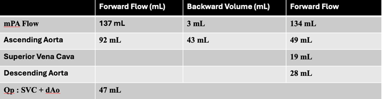 Table 2: Flow quantification by cardiac magnetic resonance (CMR) phase-contrast imaging. Main pulmonary artery (mPA) flow significantly exceeded systemic flow through the ascending aorta, consistent with a substantial left-to-right shunt. Systemic output was confirmed by summing flows through the superior vena cava (SVC) and descending aorta (dAo), yielding a Qp:Qs ratio of approximately 2.7.