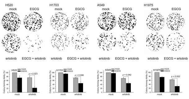 The interactions between EGCG and erlotinib were primarily additive and antagonistic at the effect levels represented as ED90 and ED75; however, at ED50, they proved to be synergistic (CI < 0.1). On the evaluation of NSCLC cell death using the trypan blue exclusion assay, EGCG and erlotinib combined therapy had an additive effect on cell death (Figure. 1C). Moreover, erlotinib and EGCG combined therapy affected cell survival for up to 3 days in NSCLC cell lines (Figure. 1D). In these four NSCLC cells, the EGCG and erlotinib combined therapy inhibited cell growth more than erlotinib alone (Figure. 1D). The colony-formation assay was then used to determine if erlotinib and/or EGCG affect longterm clonogenic cell survival. In H520 (22.57% vs. 74.00%), H1703 (45.73% vs. 73.53%), A549 (45.97% vs. 70.83%), and H1975 (30.23% vs. 63.13%) cells, the colony-forming ability of EGCG and erlotinib combined treatment was lower than that of erlotinib treatment (Figure. 2).