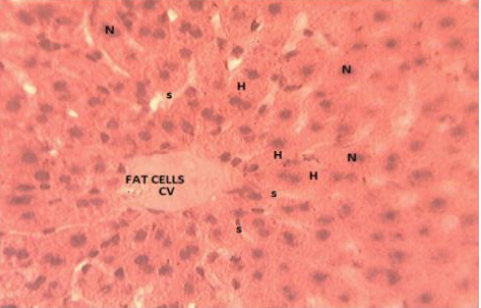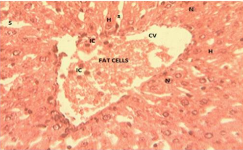 The Group D liver shows a prominent distortion on the liver cells distorting the liver architecture. The central vein (cv) dilating and filled with fat deposits and infiltered cells.