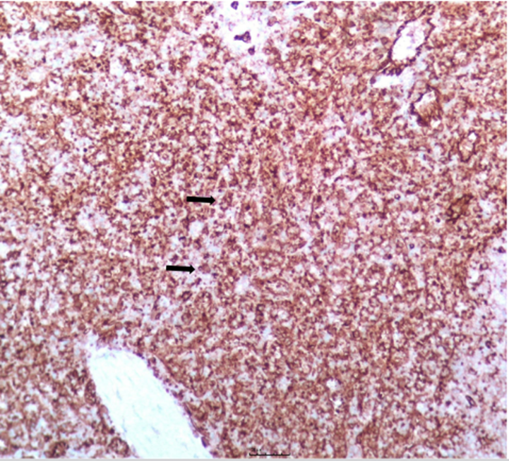 Figure 4: Tumor cells are positive for CD68 (arrow head) by immunostain showing histiocytic differentiation (H&E 100X) (magnification bar unit 20uM).