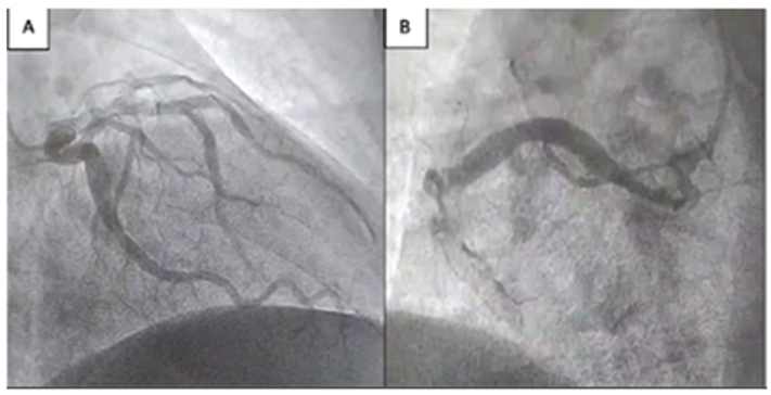 Figure 1: A. Left coronary artery without significatt lesions -Ectatic vessels. B. Largw-caliber ectatic coronary artery with acute thrombotic occlusion.