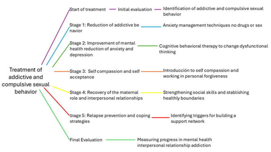 The intervention followed a multimodal design composed of 12 weekly sessions. Cognitive-behavioral therapy (CBT) was central, targeting maladaptive cognitions and behavioral triggers associated with compulsive sexual behaviors. Psychoeducation covered sexual health, consent, and the impact of trauma on sexual behaviors.