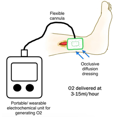 This technique is essentially the addition of a sustained supply of low-flow humidified pure oxygen to moist wound therapy. A portable electrochemical unit generates pure oxygen from the surrounding air, which is delivered to the wound through a flexible cannula and a wound contact layer of occlusive oxygen diffusion dressing (Figure 2). Purified oxygen is delivered at a constant low flow rate of 3- 15ml/hour for 24 hours a day for 7 days a week. [14,15]